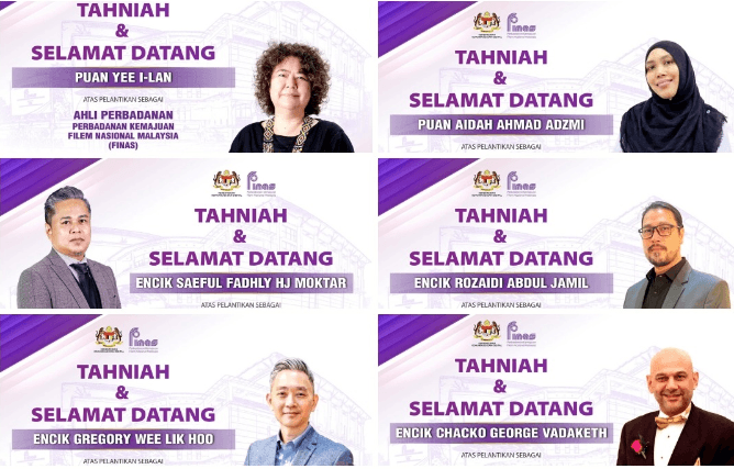 FINAS dalam kenyataan hari ini berkata mereka yang dilantik adalah Saeful Fahly Moktar; Aidah Ahmad adzmi; Chacko George Vadaketh; Rozaidi Abdul Jamil; Yee I-Lan dan Gregory Wee Lik Hoo.