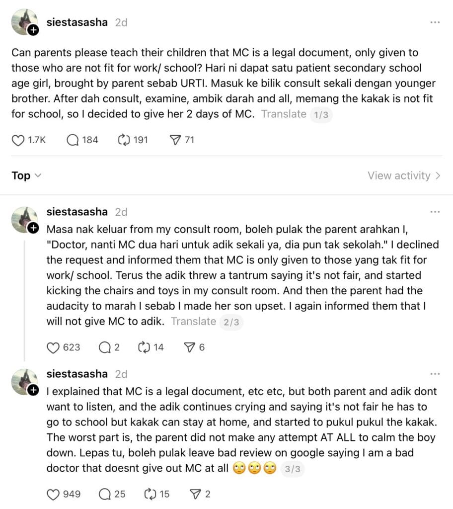 Kekecohan itu berlanjutan hingga ibu bapa terbabit meninggalkan ulasan negatif di Google, menuduhnya sebagai doktor “teruk” kerana enggan mengeluarkan MC.